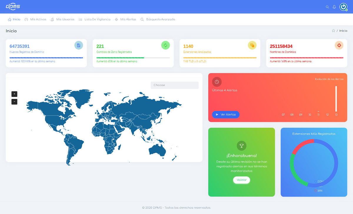 Permite proteger sus activos frente a usos o abusos, alertando de forma inmediata ante cualquier cambio de estado o situación de peligro de sus activos. Esto nos permite evitar pérdidas accidentales de activos al no controlar su fecha de renovación, o situaciones en las que se modifiquen los servidores o datos de sus nombres de dominio.